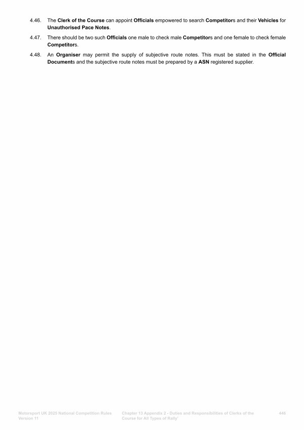 4.46. The Clerk of the Course can appoint Officials empowered to search Competitors and their Vehicles for Unauthorised Pace Notes.