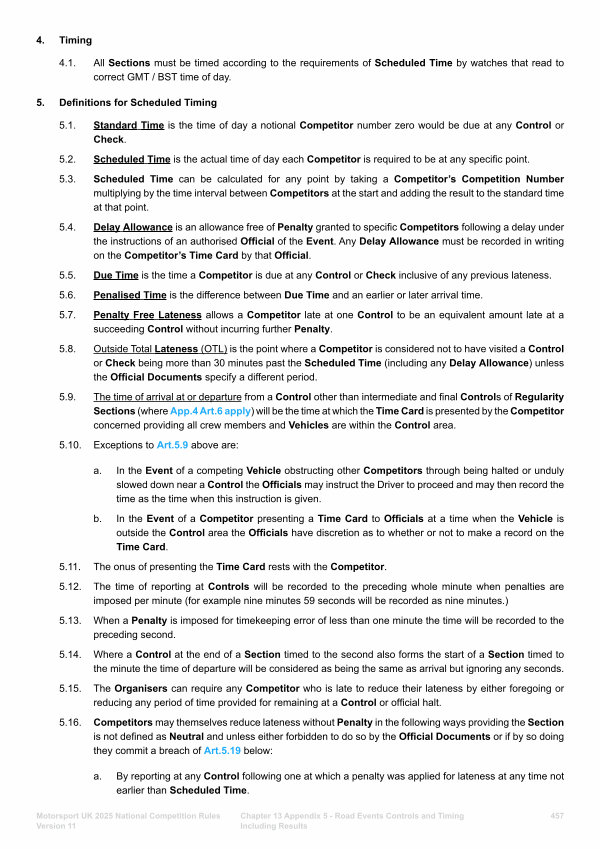5.9. The time of arrival at or departure from a Control other than intermediate and final Controls of Regularity Sections( where App. 4 Art. 6 apply) will be the time at which the Time Card is presented by the Competitor concerned providing all crew members and Vehicles are within the Control area.
