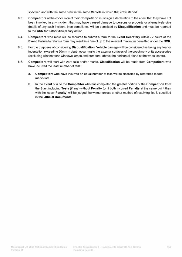 6.3. Competitors at the conclusion of their Competition must sign a declaration to the effect that they have not been involved in any incident that may have caused damage to persons or property or alternatively give details of any such incident. Non-compliance will be penalised by Disqualification and must be reported to the ASN for further disciplinary action.