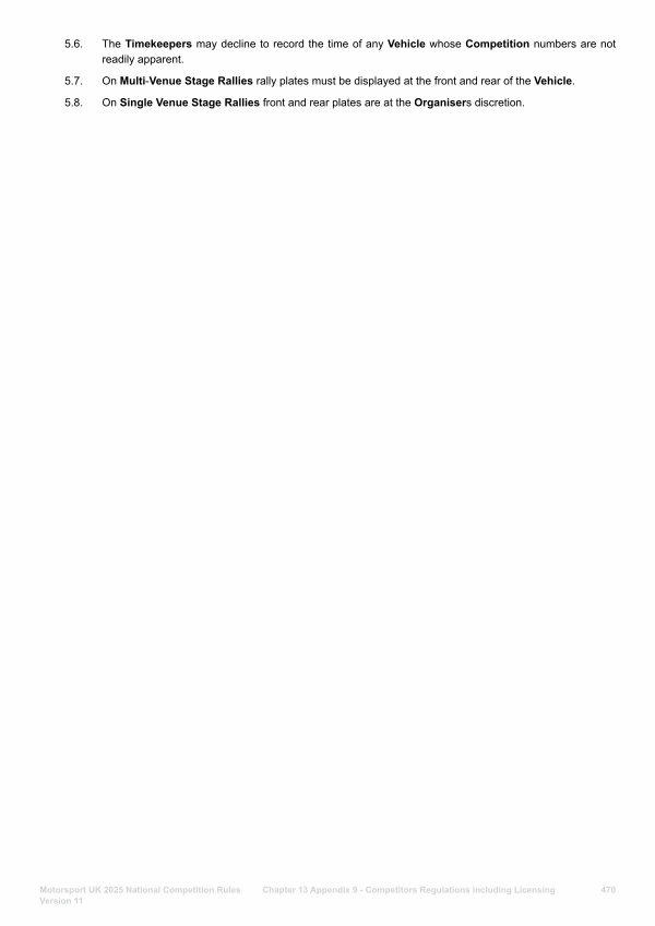 5.7. On Multi-Venue Stage Rallies rally plates must be displayed at the front and rear of the Vehicle. 5.8. On Single Venue Stage Rallies front and rear plates are at the Organisers discretion.