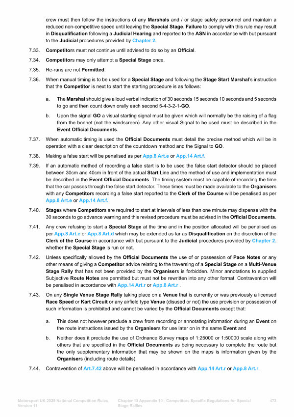 7.41. Any crew refusing to start a Special Stage at the time and in the position allocated will be penalised as per App. 8 Art. e or App. 8 Art. d which may be extended as far as Disqualification on the discretion of the Clerk of the Course in accordance with but pursuant to the Judicial procedures provided by Chapter 2. whether the Special Stage is run or not.