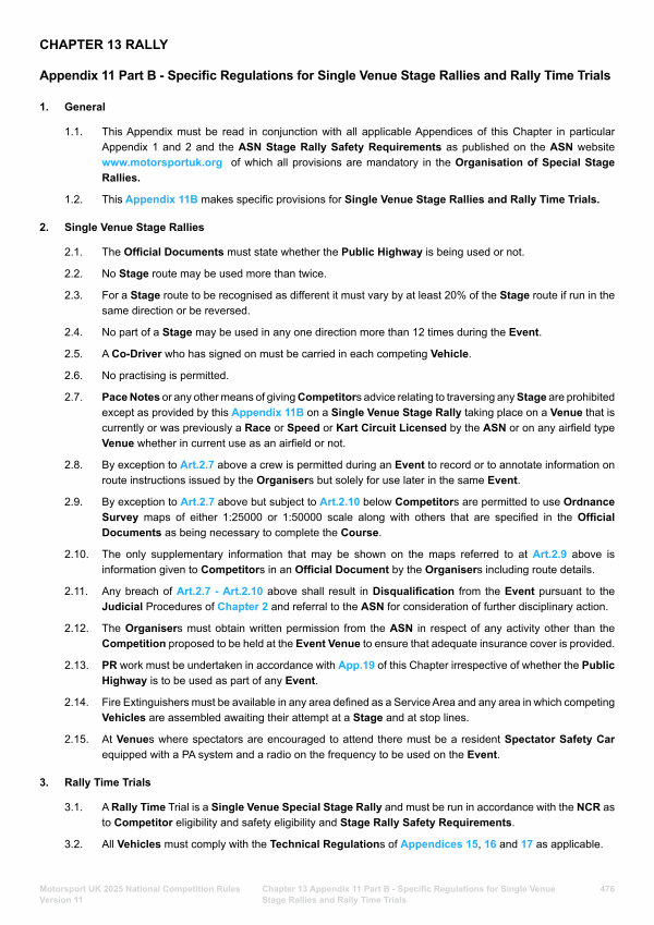 Chapter 13 Appendix 11 Part B- Specific Regulations for Single Venue Stage Rallies and Rally Time Trials