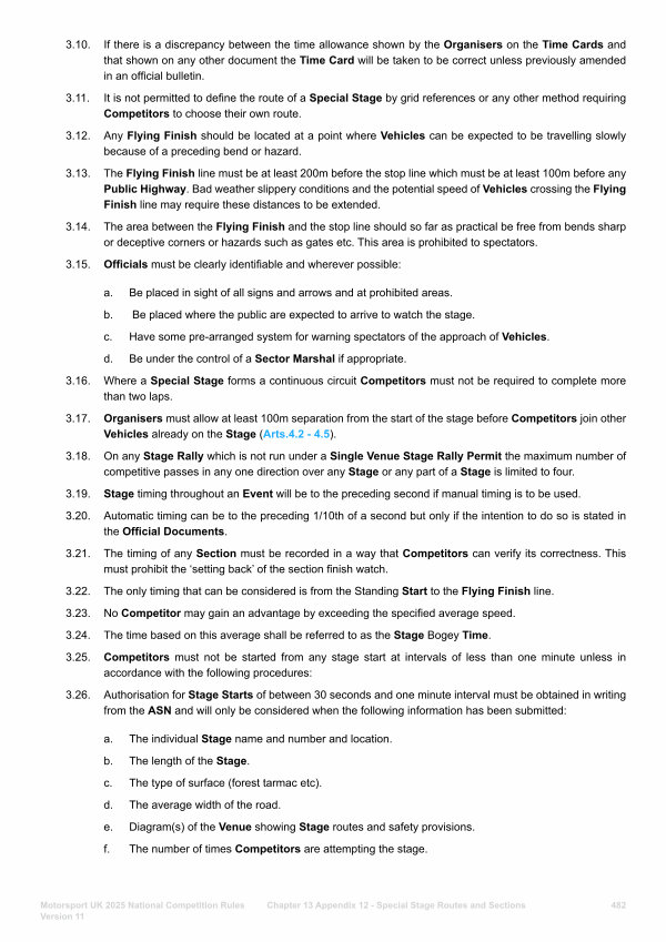 3.22. The only timing that can be considered is from the Standing Start to the Flying Finish line. 3.23. No Competitor may gain an advantage by exceeding the specified average speed. 3.24. The time based on this average shall be referred to as the Stage Bogey Time.