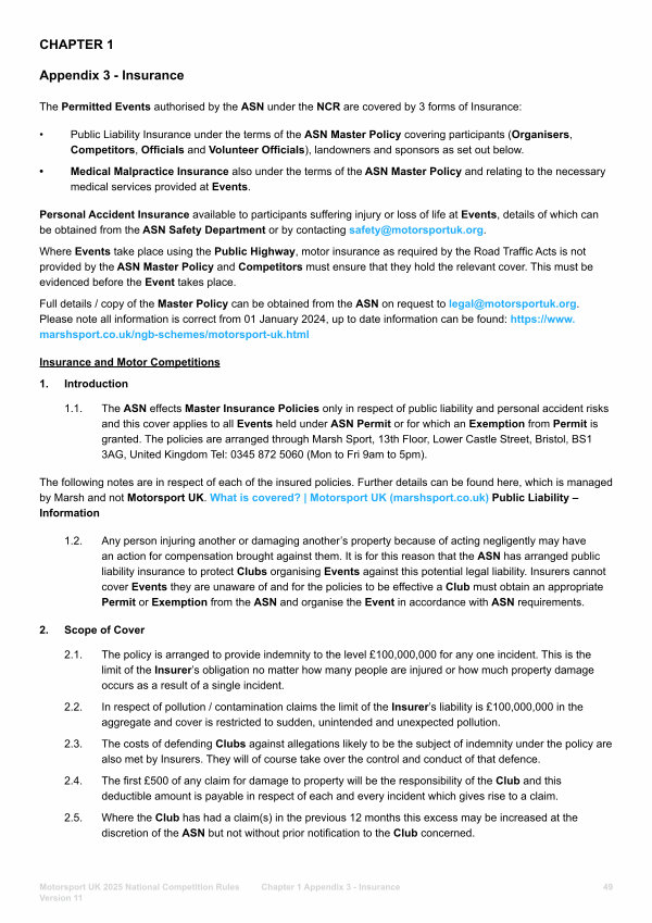 Full details / copy of the Master Policy can be obtained from the ASN on request to legal @ motorsportuk. org. Please note all information is correct from 01 January 2024, up to date information can be found: https:// www. marshsport. co. uk / ngb-schemes / motorsport-uk. html