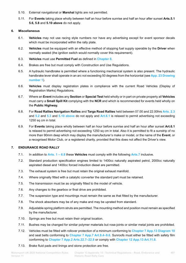 7. ENDURANCE ROAD RALLY 7.1. In addition to Arts. 1 – 6.8 these Vehicles must comply with the following Arts. 7 inclusive.