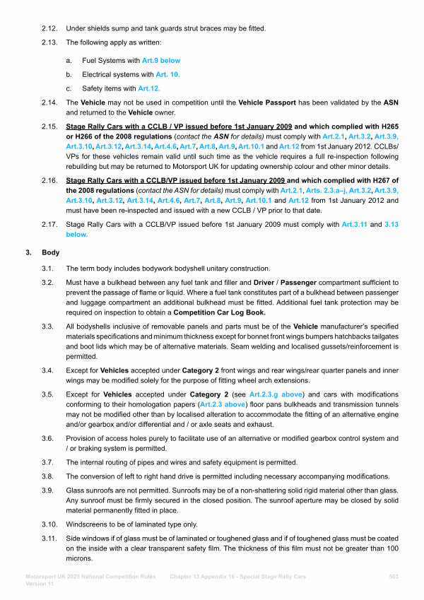 2.15. Stage Rally Cars with a CCLB / VP issued before 1st January 2009 and which complied with H265 or H266 of the 2008 regulations( contact the ASN for details) must comply with Art. 2.1, Art. 3.2, Art. 3.9, Art. 3.10, Art. 3.12, Art. 3.14, Art. 4.6, Art. 7, Art. 8, Art. 9, Art. 10.1 and Art. 12 from 1st January 2012. CCLBs / VPs for these vehicles remain valid until such time as the vehicle requires a full re-inspection following rebuilding but may be returned to Motorsport UK for updating ownership colour and other minor details.