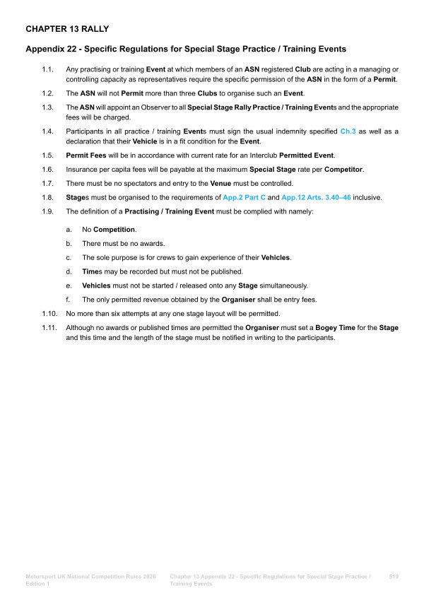 Chapter 13 Appendix 22- Specific Regulations for Special Stage Practice / Training Events