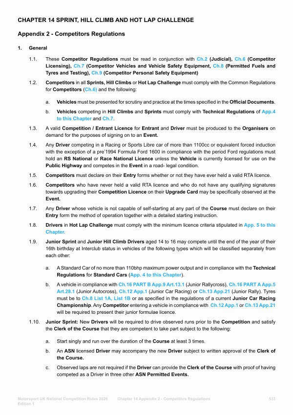 1.2. Competitors in all Sprints, Hill Climbs or Hot Lap Challenge must comply with the Common Regulations for Competitors( Ch. 6) and the following: