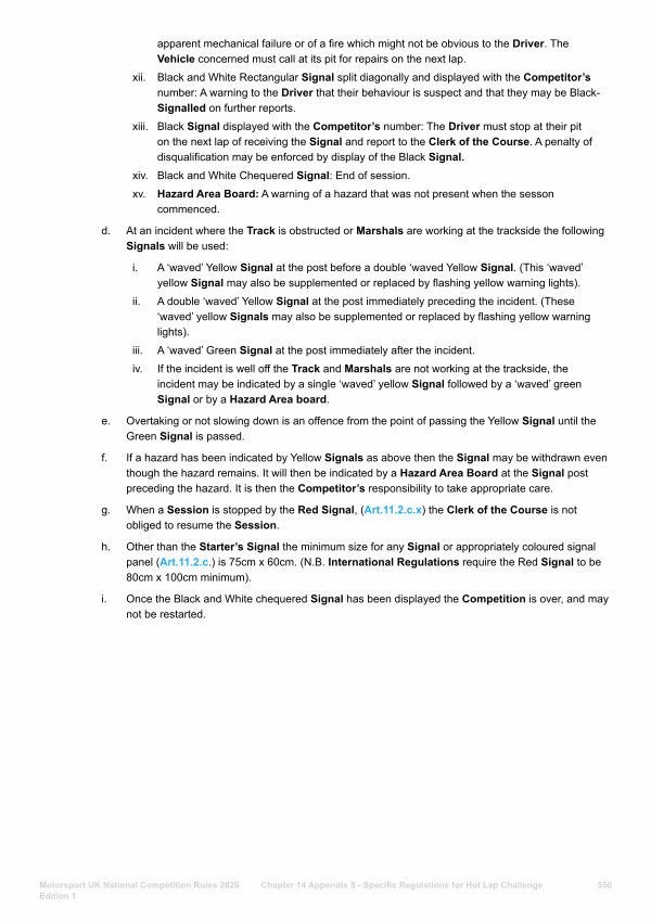 xii. apparent mechanical failure or of a fire which might not be obvious to the Driver. The Vehicle concerned must call at its pit for repairs on the next lap. Black and White Rectangular Signal split diagonally and displayed with the Competitor’ s number: A warning to the Driver that their behaviour is suspect and that they may be Black- Signalled on further reports. xiii. Black Signal displayed with the Competitor’ s number: The Driver must stop at their pit on the next lap of receiving the Signal and report to the Clerk of the Course. A penalty of disqualification may be enforced by display of the Black Signal. xiv. Black and White Chequered Signal: End of session. xv.