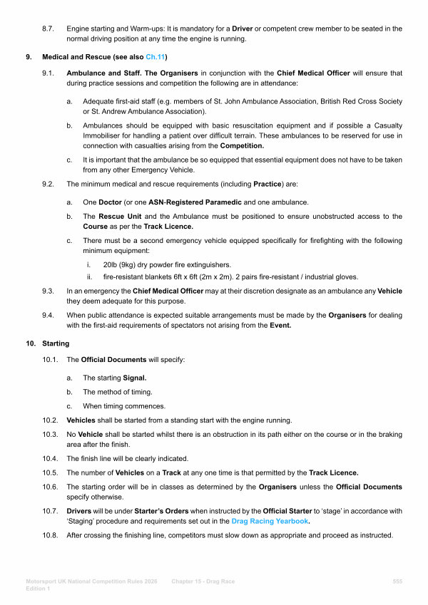 10.7. Drivers will be under Starter’ s Orders when instructed by the Official Starter to‘ stage’ in accordance with‘ Staging’ procedure and requirements set out in the Drag Racing Yearbook.