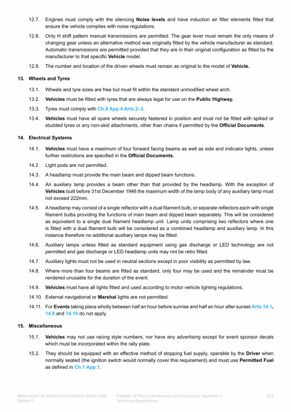 12.7. Engines must comply with the silencing Noise levels and have induction air filter elements fitted that ensure the vehicle complies with noise regulations.