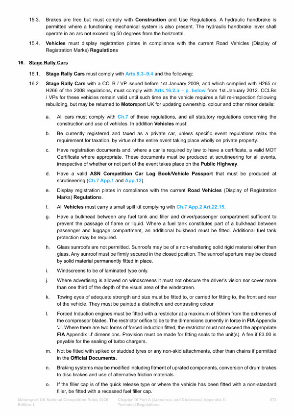 16.2. Stage Rally Cars with a CCLB / VP issued before 1st January 2009, and which complied with H265 or H266 of the 2008 regulations, must comply with Arts. 16.2. a – p. below from 1st January 2012. CCLBs / VPs for these vehicles remain valid until such time as the vehicle requires a full re-inspection following rebuilding, but may be returned to Motorsport UK for updating ownership, colour and other minor details: