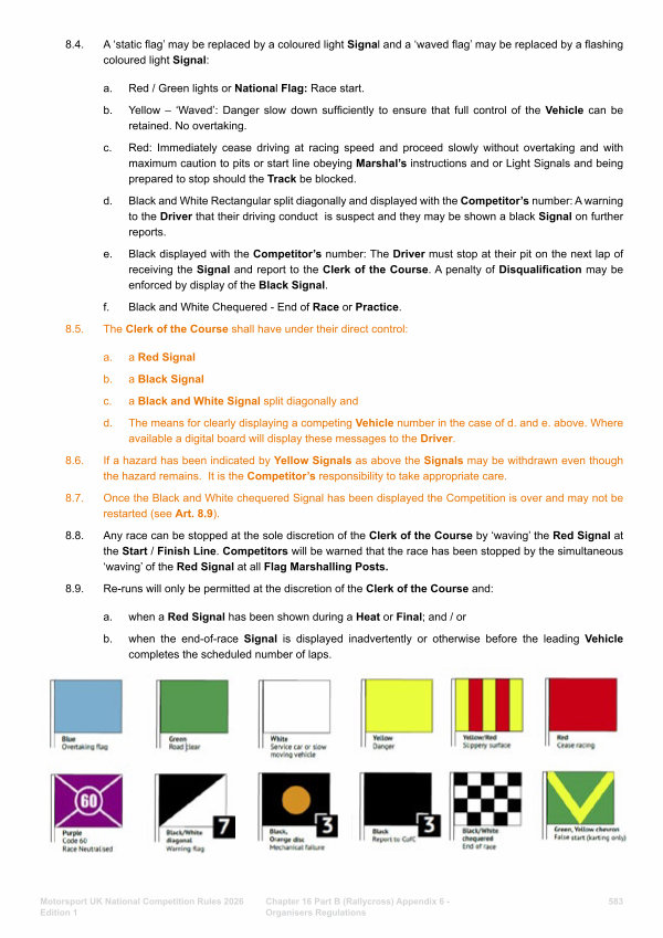 8.8. Any race can be stopped at the sole discretion of the Clerk of the Course by‘ waving’ the Red Signal at the Start / Finish Line. Competitors will be warned that the race has been stopped by the simultaneous‘ waving’ of the Red Signal at all Flag Marshalling Posts.