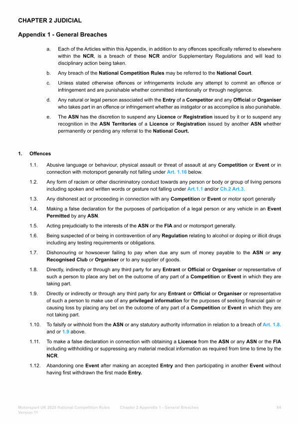 Each of the Articles within this Appendix, in addition to any offences specifically referred to elsewhere within the NCR, is a breach of these NCR and / or Supplementary Regulations and will lead to disciplinary action being taken.