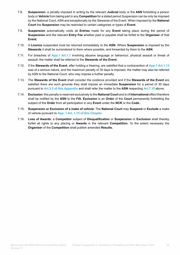 7.8. Suspension: a penalty imposed in writing by the relevant Judicial body or the ASN forbidding a person body or Vehicle from taking part in any Competition for a stated period. Suspension can be only be imposed by the National Court, ASN and exceptionally by the Stewards of the Event. When imposed by the National Court the Suspension may be restricted to certain categories or types of Event.