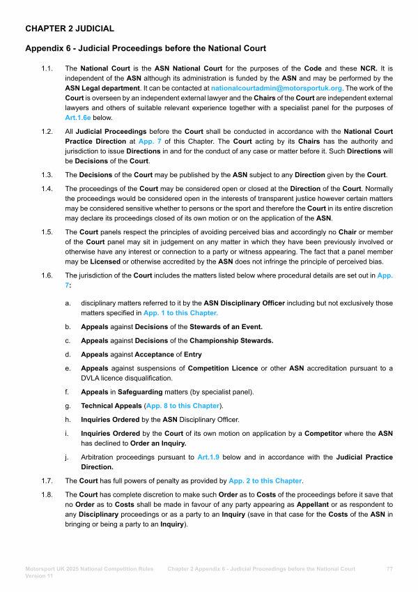 1.1. The National Court is the ASN National Court for the purposes of the Code and these NCR. It is independent of the ASN although its administration is funded by the ASN and may be performed by the ASN Legal department. It can be contacted at nationalcourtadmin @ motorsportuk. org. The work of the Court is overseen by an independent external lawyer and the Chairs of the Court are independent external lawyers and others of suitable relevant experience together with a specialist panel for the purposes of Art. 1.6e below.