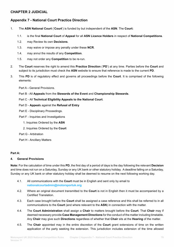 Part A- General Provisions. Part B- All Appeals from the Stewards of the Event and Championship Stewards. Part C- All Technical Eligibility Appeals to the National Court. Part D- Appeals against the Refusal of Entry Part E- Disciplinary Proceedings. Part F- Inquiries and Investigations 1. Inquiries Ordered by the ASN 2. Inquiries Ordered by the Court Part G- Arbitration Part H- Ancillary Matters