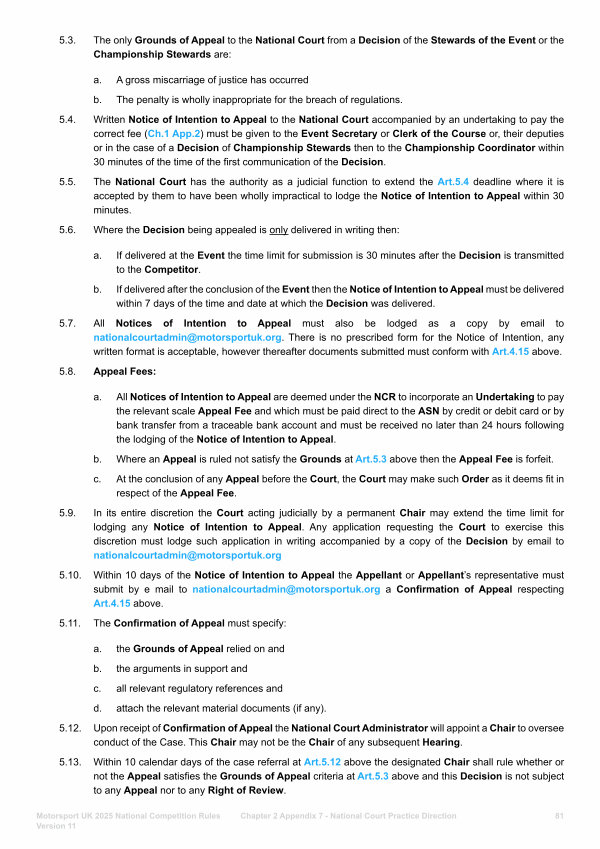 5.10. Within 10 days of the Notice of Intention to Appeal the Appellant or Appellant’ s representative must submit by e mail to nationalcourtadmin @ motorsportuk. org a Confirmation of Appeal respecting Art. 4.15 above.