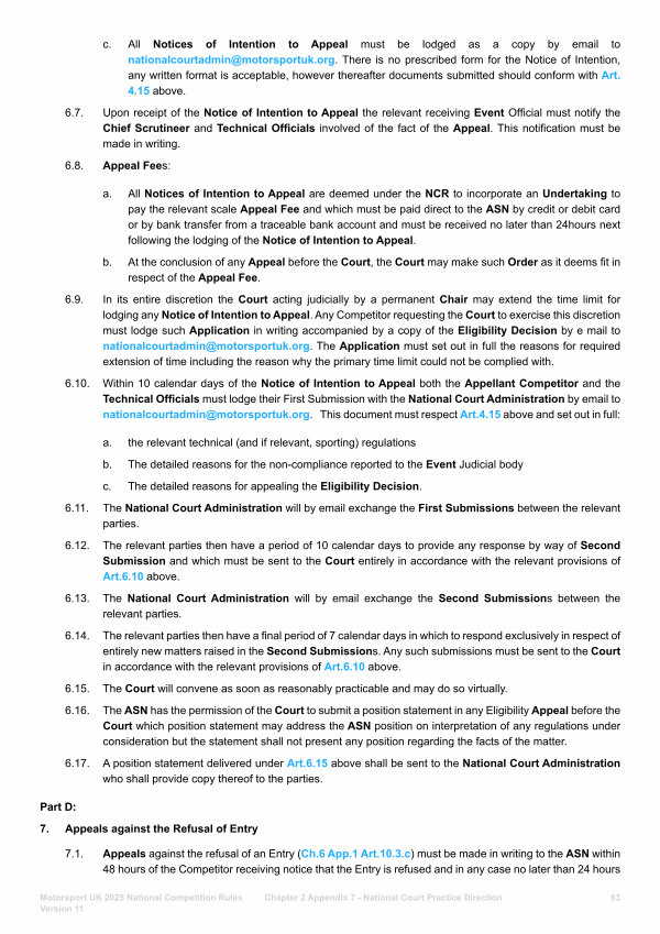6.10. Within 10 calendar days of the Notice of Intention to Appeal both the Appellant Competitor and the Technical Officials must lodge their First Submission with the National Court Administration by email to nationalcourtadmin @ motorsportuk. org. This document must respect Art. 4.15 above and set out in full: