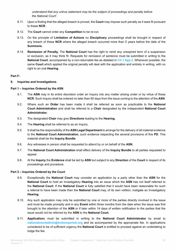 9.11. Applications must be submitted in writing to the National Court Administrator by email to nationalcourtadmin @ motorsportuk. org and be accompanied by the appropriate fee. In applications considered to be of sufficient urgency the National Court is entitled to proceed against an undertaking to lodge the fee.