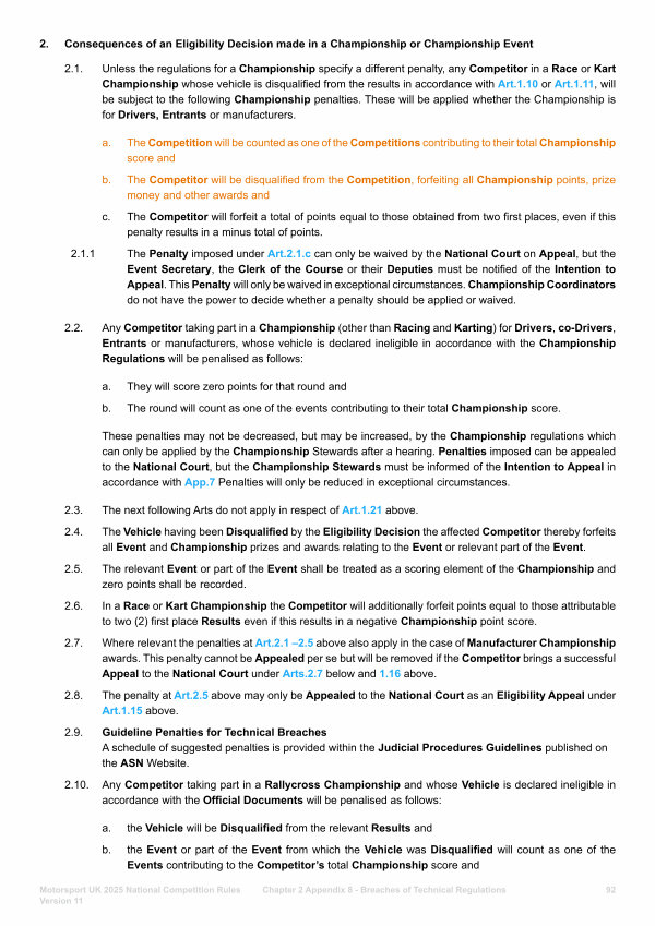 2.7. Where relevant the penalties at Art. 2.1 – 2.5 above also apply in the case of Manufacturer Championship awards. This penalty cannot be Appealed per se but will be removed if the Competitor brings a successful Appeal to the National Court under Arts. 2.7 below and 1.16 above.