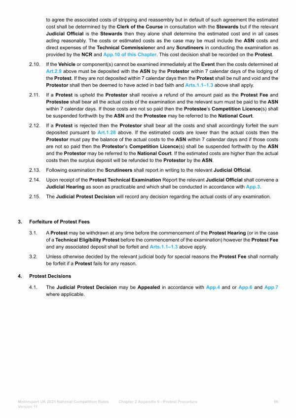 2.11. If a Protest is upheld the Protestor shall receive a refund of the amount paid as the Protest Fee and Protestee shall bear all the actual costs of the examination and the relevant sum must be paid to the ASN within 7 calendar days. If those costs are not so paid then the Protestee’ s Competition Licence( s) shall be suspended forthwith by the ASN and the Protestee may be referred to the National Court.