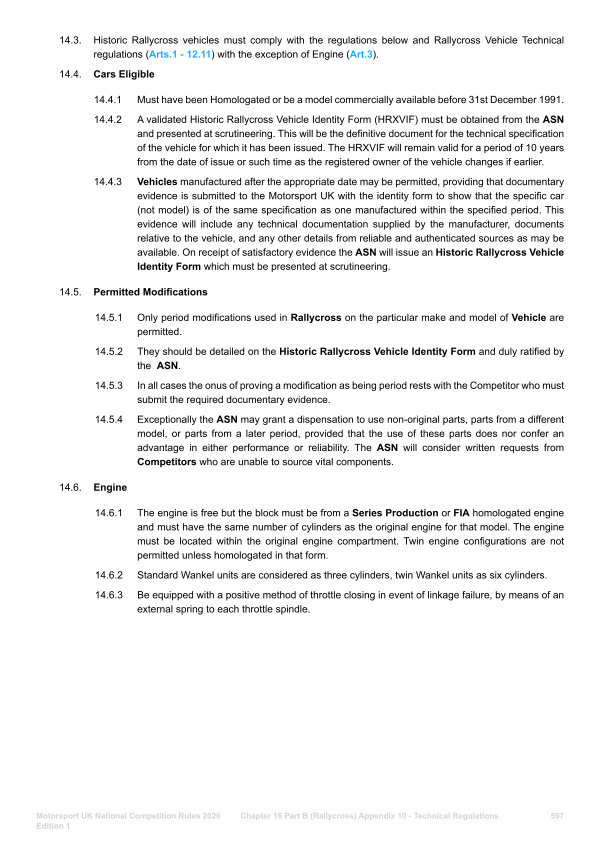 14.4.3 Vehicles manufactured after the appropriate date may be permitted, providing that documentary evidence is submitted to the Motorsport UK with the identity form to show that the specific car( not model) is of the same specification as one manufactured within the specified period. This evidence will include any technical documentation supplied by the manufacturer, documents relative to the vehicle, and any other details from reliable and authenticated sources as may be available. On receipt of satisfactory evidence the ASN will issue an Historic Rallycross Vehicle Identity Form which must be presented at scrutineering.
