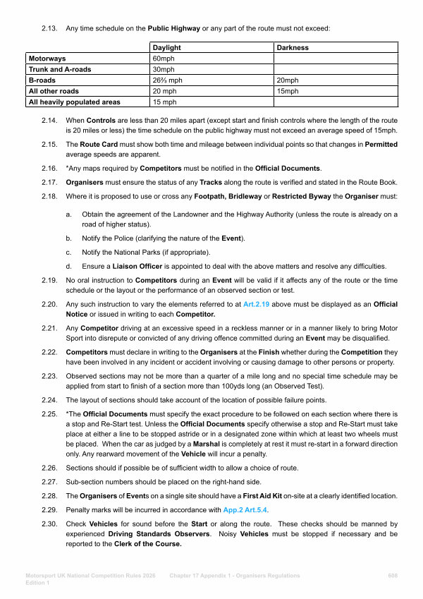 2.16. * Any maps required by Competitors must be notified in the Official Documents. 2.17. Organisers must ensure the status of any Tracks along the route is verified and stated in the Route Book. 2.18. Where it is proposed to use or cross any Footpath, Bridleway or Restricted Byway the Organiser must: