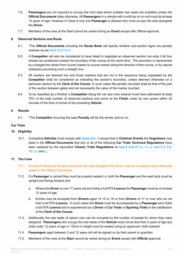 7.6. Passengers are not required to occupy the front seat where suitable rear seats are available unless the Official Documents state otherwise. All Passengers in a vehicle with a soft-top or no roof must be at least 14 years of age. However in Class 8 only one Passenger is allowed who must occupy the seat alongside the Driver.
