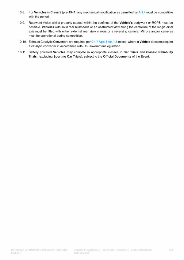 10.11. Battery powered Vehicles may compete in appropriate classes in Car Trials and Classic Reliability Trials,( excluding Sporting Car Trials), subject to the Official Documents of the Event.