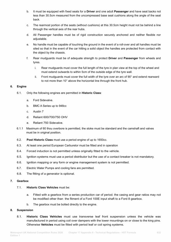 6.2. Post Historic Class must use a period engine of up to 1650cc. 6.3. At least one period European Carburetor must be fitted and in operation 6.4. Forced induction is not permitted unless originally fitted to the vehicle. 6.5. Ignition systems must use a period distributor but the use of a contact breaker is not mandatory. 6.6. Ignition mapping or any form or engine management system is not permitted. 6.7. Electric Water Pumps and cooling fans are permitted. 6.8. The fitting of a generator is optional.