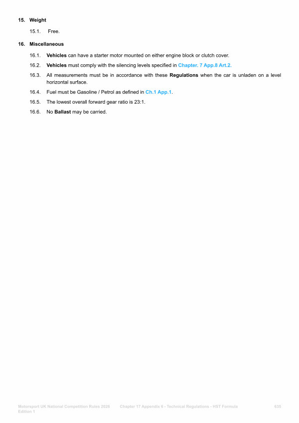 16.4. Fuel must be Gasoline / Petrol as defined in Ch. 1 App. 1. 16.5. The lowest overall forward gear ratio is 23:1. 16.6. No Ballast may be carried.