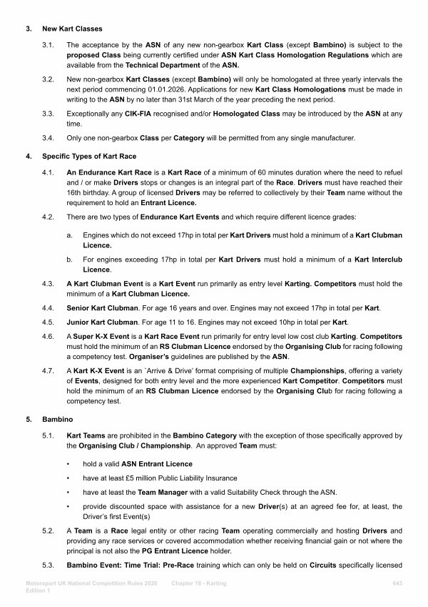 3.2. New non-gearbox Kart Classes( except Bambino) will only be homologated at three yearly intervals the next period commencing 01.01.2026. Applications for new Kart Class Homologations must be made in writing to the ASN by no later than 31st March of the year preceding the next period.