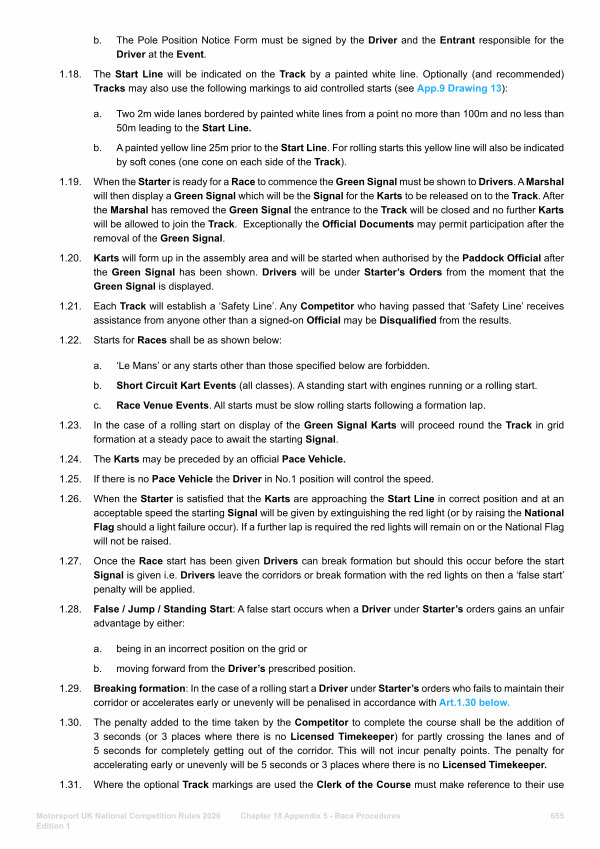 1.20. Karts will form up in the assembly area and will be started when authorised by the Paddock Official after the Green Signal has been shown. Drivers will be under Starter’ s Orders from the moment that the Green Signal is displayed.