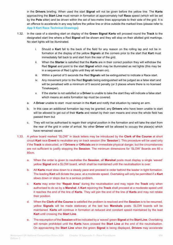 1.32. In the case of a standing start on display of the Green Signal Karts will proceed round the Track to the designated start line where a Red Signal will be shown and they will stop on their allotted grid markings. No start lights will be illuminated.