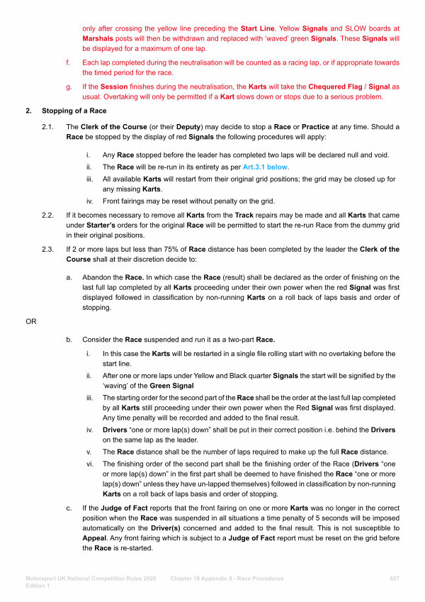 2.1. The Clerk of the Course( or their Deputy) may decide to stop a Race or Practice at any time. Should a Race be stopped by the display of red Signals the following procedures will apply: