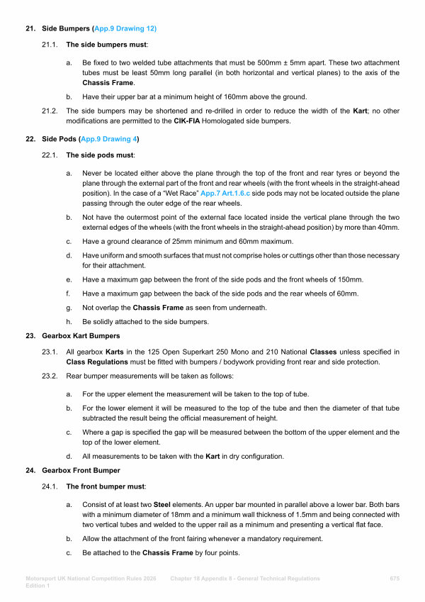 23.1. All gearbox Karts in the 125 Open Superkart 250 Mono and 210 National Classes unless specified in Class Regulations must be fitted with bumpers / bodywork providing front rear and side protection.