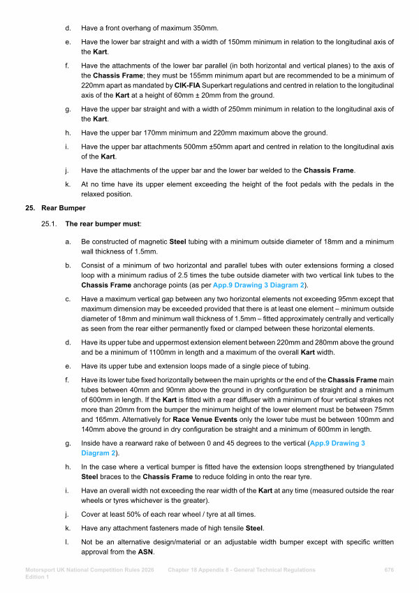 Have its lower tube fixed horizontally between the main uprights or the end of the Chassis Frame main tubes between 40mm and 90mm above the ground in dry configuration be straight and a minimum of 600mm in length. If the Kart is fitted with a rear diffuser with a minimum of four vertical strakes not more than 20mm from the bumper the minimum height of the lower element must be between 75mm and 165mm. Alternatively for Race Venue Events only the lower tube must be between 100mm and 140mm above the ground in dry configuration be straight and a minimum of 600mm in length.