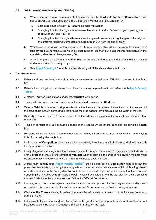 3.11. A maximum penalty( see App. 9 Penalty Tables.) shall be applied if a Competitor fails to follow the prescribed test route by passing the wrong side of one or more markers crosses with both leading wheels a marked test line in the wrong direction out of the prescribed sequence or too many / few times without correcting the mistakes by returning to the point where they deviated from the test diagram before crossing the test finish line unless otherwise specified in the Official Documents.