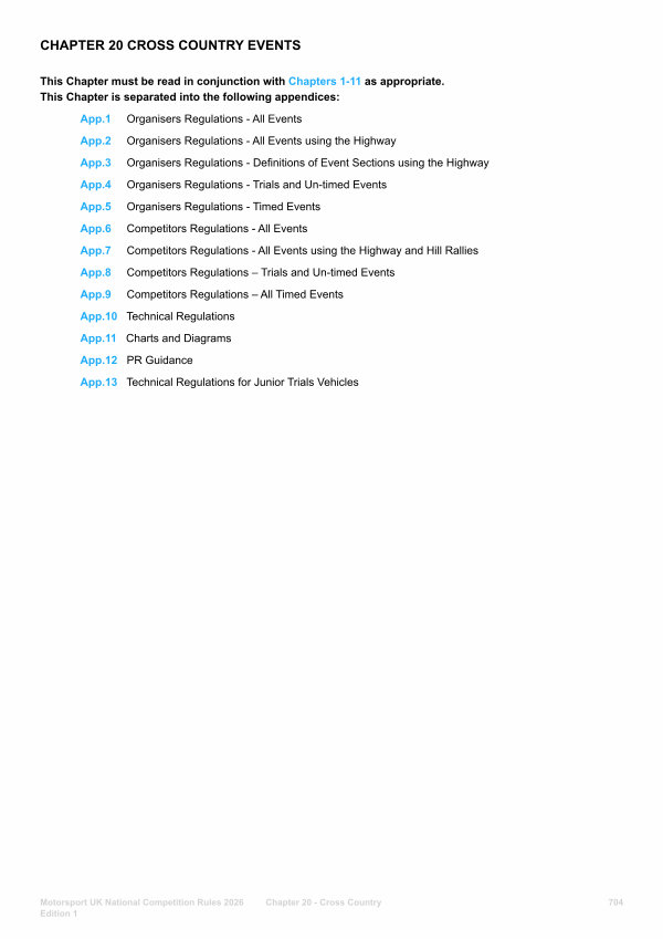 Organisers Regulations- All Events Organisers Regulations- All Events using the Highway Organisers Regulations- Definitions of Event Sections using the Highway Organisers Regulations- Trials and Un-timed Events Organisers Regulations- Timed Events Competitors Regulations- All Events Competitors Regulations- All Events using the Highway and Hill Rallies Competitors Regulations – Trials and Un-timed Events Competitors Regulations – All Timed Events App. 10 Technical Regulations App. 11 Charts and Diagrams App. 12 PR Guidance App. 13 Technical Regulations for Junior Trials Vehicles