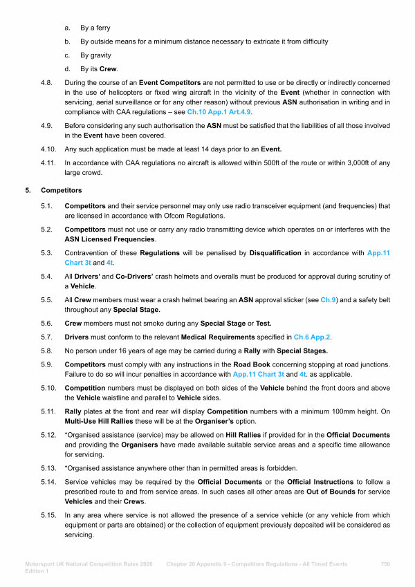 5.6. Crew members must not smoke during any Special Stage or Test. 5.7. Drivers must conform to the relevant Medical Requirements specified in Ch. 6 App. 2. 5.8. No person under 16 years of age may be carried during a Rally with Special Stages.