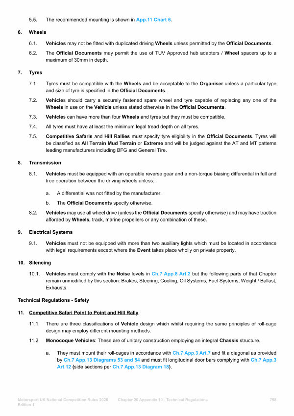 7.5. Competitive Safaris and Hill Rallies must specify tyre eligibility in the Official Documents. Tyres will be classified as All Terrain Mud Terrain or Extreme and will be judged against the AT and MT patterns leading manufacturers including BFG and General Tire.