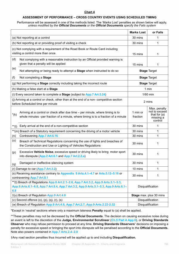 ** These penalties may not be decreased by the Official Documents. The decision on causing excessive noise during an event is left to the discretion of the Judge, Environmental Scrutineer( Ch. 5 Part A App. 6), or Driving Standards Observer who may refuse permission to proceed at any time. Driving Standards Observers’ decisions on imposing a penalty for excessive speed or bringing the sport into disrepute will be penalised according to the Official Documents. Note also powers contained in App. 7 Arts. 2.4 – 2.8
