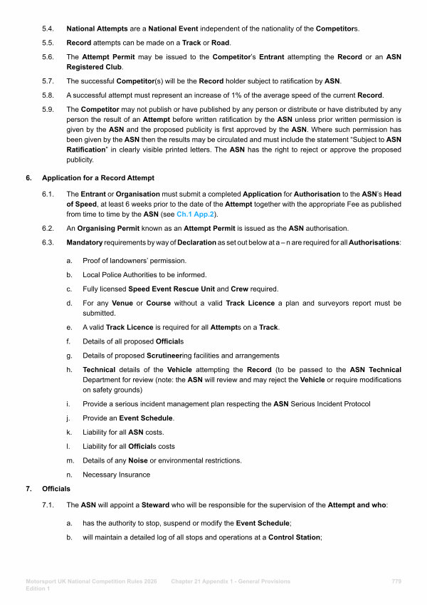 6.1. The Entrant or Organisation must submit a completed Application for Authorisation to the ASN’ s Head of Speed, at least 6 weeks prior to the date of the Attempt together with the appropriate Fee as published from time to time by the ASN( see Ch. 1 App. 2).