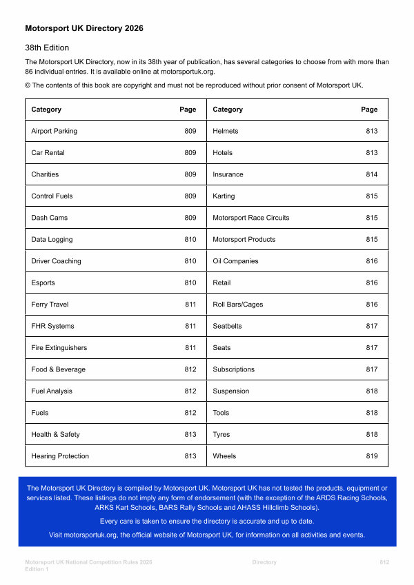 The Motorsport UK Directory, now in its 38th year of publication, has several categories to choose from with more than 86 individual entries. It is available online at motorsportuk. org.