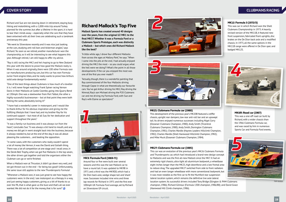 MK27: Clubmans Formula car( 1985) This car was an evolution of the previous year’ s MK26 Clubmans Formula and Thundersports car, which had introduced a brand-new design concept to Mallocks and was the first all-new Mallock since the MK7. It had an extremely rigid chassis, ultra-light all-aluminium bodywork, a wheelbase eight inches longer than the MK25, high downforce and a low frontal area to reduce drag. The upgraded MK27 switched from side to front radiators and had an even longer wheelbase with more conventional bodywork, but it was most notable as the first car to fit the Mumford rear suspension lateral location system, which remains the definitive live axle lateral location system. Its successful drivers included Tony Bridge( Slington & PHM Clubmans champion, 1986); Richard Gilmour( Formula 1300 champion, 1986 / 88); and David Grace( Harewood Hill Climb champion, 1986).