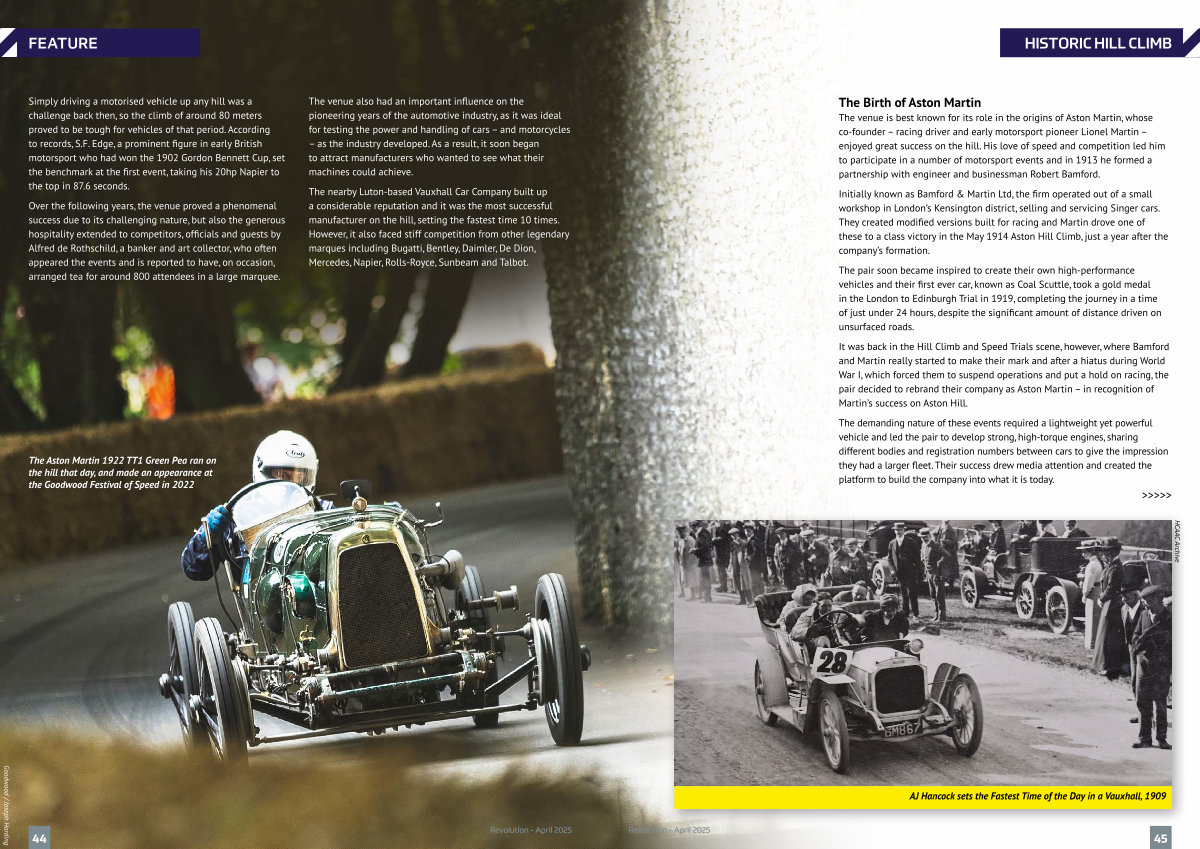 The venue is best known for its role in the origins of Aston Martin, whose co-founder – racing driver and early motorsport pioneer Lionel Martin – enjoyed great success on the hill. His love of speed and competition led him to participate in a number of motorsport events and in 1913 he formed a partnership with engineer and businessman Robert Bamford.