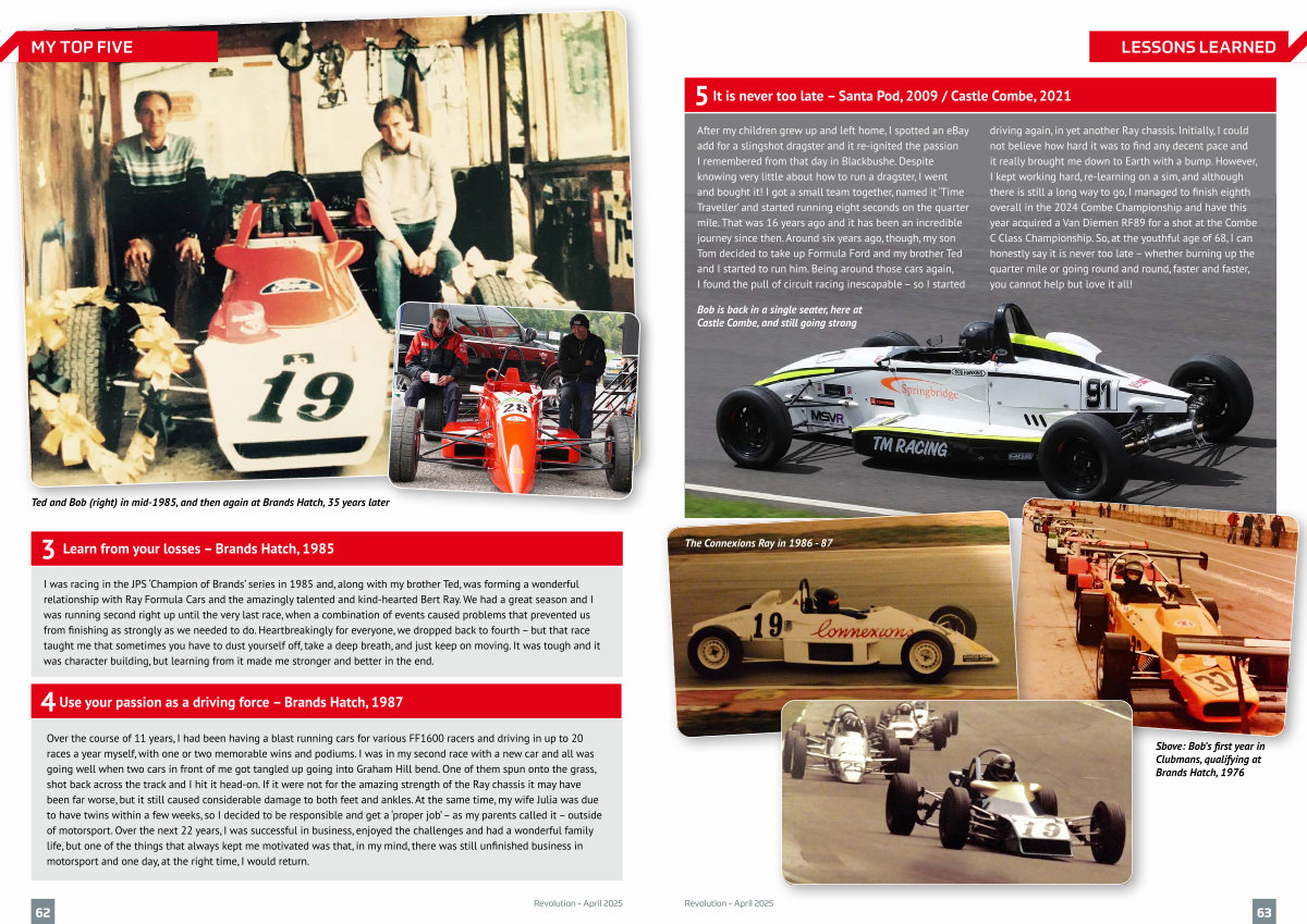 driving again, in yet another Ray chassis. Initially, I could not believe how hard it was to find any decent pace and it really brought me down to Earth with a bump. However, I kept working hard, re-learning on a sim, and although there is still a long way to go, I managed to finish eighth overall in the 2024 Combe Championship and have this year acquired a Van Diemen RF89 for a shot at the Combe C Class Championship. So, at the youthful age of 68, I can honestly say it is never too late – whether burning up the quarter mile or going round and round, faster and faster, you cannot help but love it all!