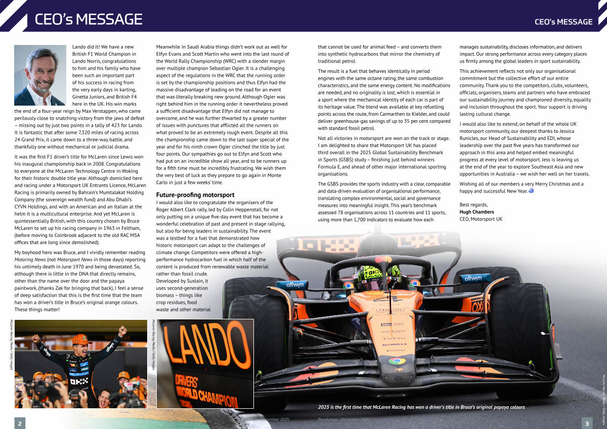 I would also like to congratulate the organisers of the Roger Albert Clark rally, led by Colin Heppenstall, for not only putting on a unique five-day event that has become a wonderful celebration of past and present in stage rallying, but also for being leaders in sustainability. The event was a testbed for a fuel that demonstrated how historic motorsport can adapt to the challenges of climate change. Competitors were offered a highperformance hydrocarbon fuel in which half of the content is produced from renewable waste material rather than fossil crude. Developed by Sustain, it uses second-generation biomass – things like crop residues, food waste and other material