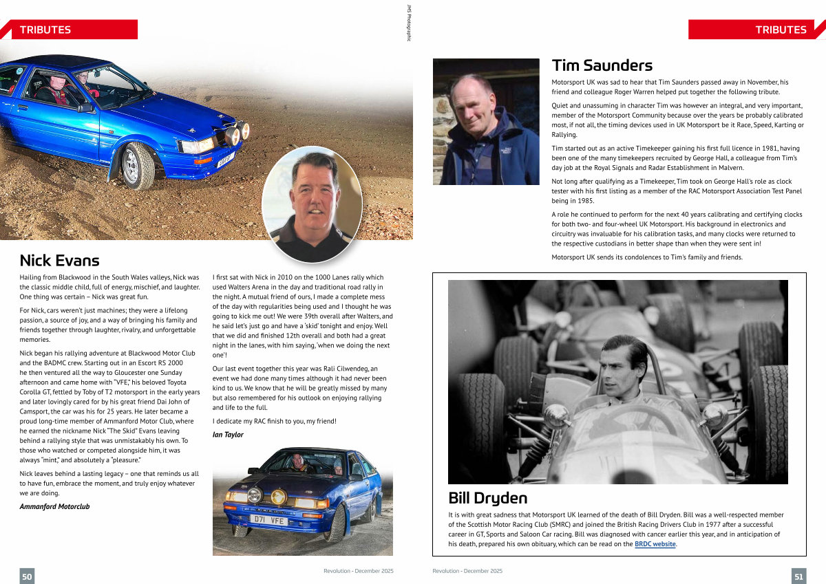 Nick began his rallying adventure at Blackwood Motor Club and the BADMC crew. Starting out in an Escort RS 2000 he then ventured all the way to Gloucester one Sunday afternoon and came home with“ VFE,” his beloved Toyota Corolla GT, fettled by Toby of T2 motorsport in the early years and later lovingly cared for by his great friend Dai John of Camsport, the car was his for 25 years. He later became a proud long‐time member of Ammanford Motor Club, where he earned the nickname Nick“ The Skid” Evans leaving behind a rallying style that was unmistakably his own. To those who watched or competed alongside him, it was always“ mint,” and absolutely a“ pleasure.”